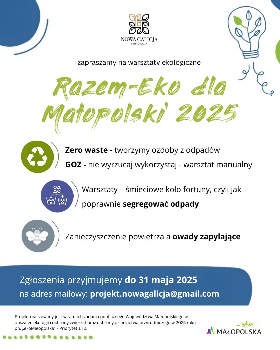 Fundacja Nowa Galicja informuje, że w okresie do 19 do 31 maja 2025 roku będzie prowadziła rekrutację do projekt pn. Razem–Eko dla Małopolski 2025